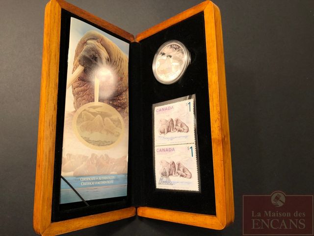 Lot # 234 - Ensemble Épreuve Le Morse de l'Atlantique et son petit (2005) pièce de 5 Dollars en Argent fin 99,99% avec timbres (PAS DE TAXE) VENDU