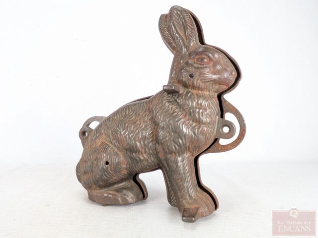 Lot # 136 - Ancien moule à chocolat en forme de lapin avec inscriptions, fait en fonte et mesurant 10.25 pouces
