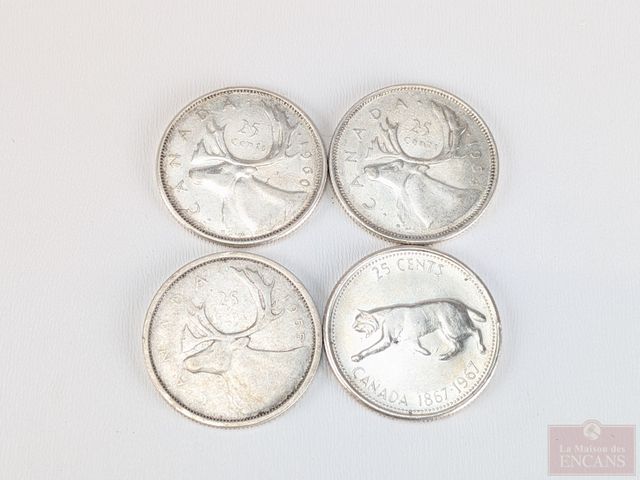 Lot de pièces canadiennes de vingt cinq sous en argent, comprenant 1955-60-64-67