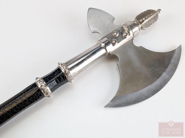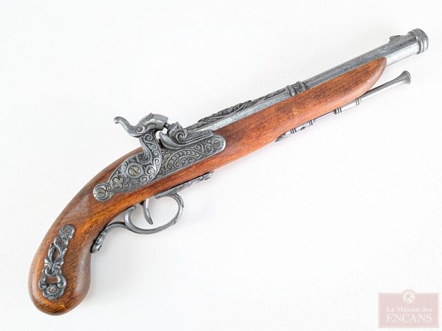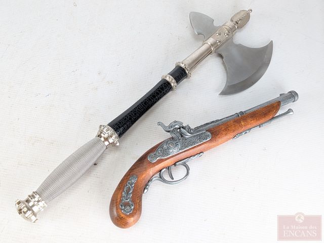 Lot # 142 - Reproduction d'une hachette de guerre médiévale, mesurant 21.5 pouces, ainsi qu'une reproduction d'un pistolet à silex à mécanisme fonctionnel