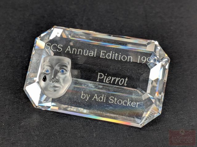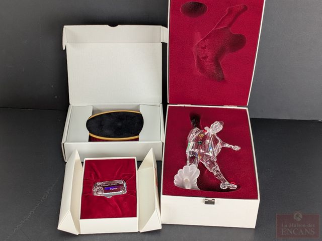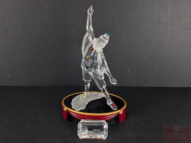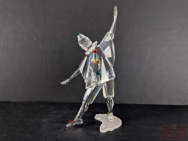 Lot # 46 - Figurine en cristal Swarovski Mascarade Pierrot 1999 de la série de trois 1999-2000-2001, mesurant 8 pouces, dans sa boite avec certificat, ainsi que sa base et sa plaque (vendus séparément à l'origine)