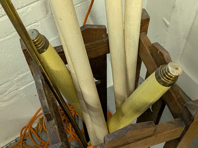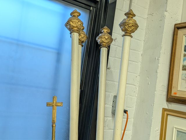 Lot # 31 - Lot de supports à bannières religieuses, ainsi que brules-cierges, le plus grand support mesurant 70 pouces