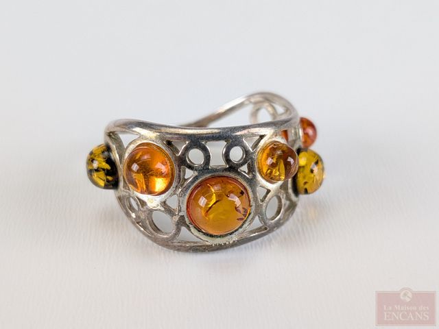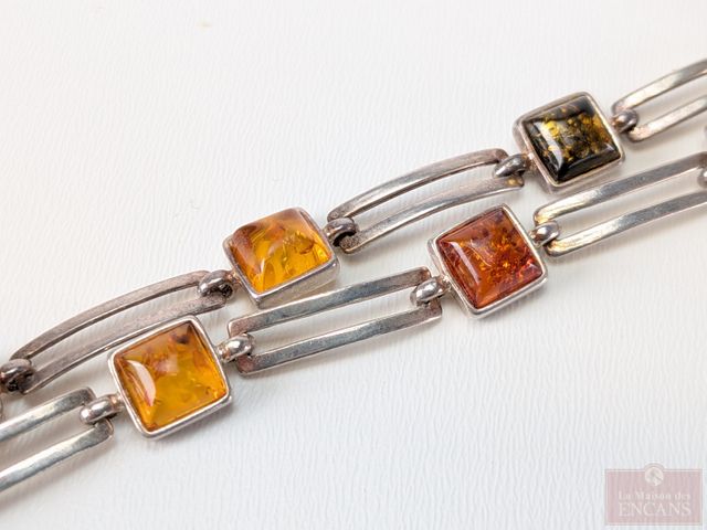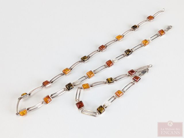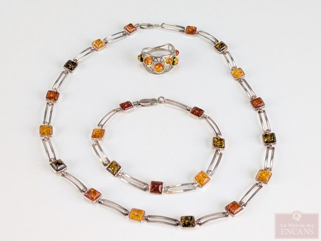 Lot # 232 - Ensemble de bijoux en argent comprenant collier, bracelet et bague sertis d'ambre, le collier mesurant 16 pouces, le bracelet mesurant 7.5 pouces et bague de taille 9