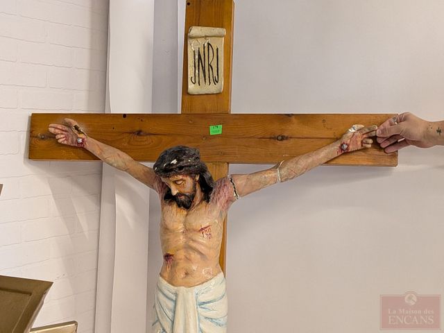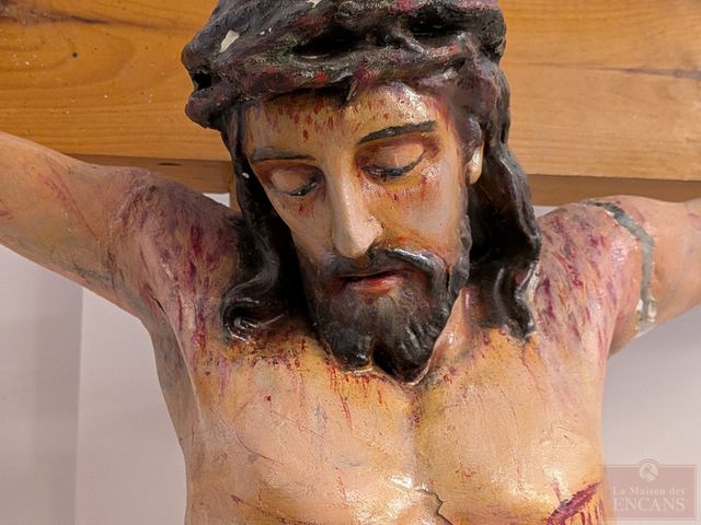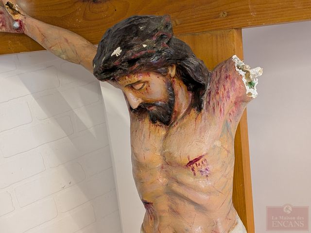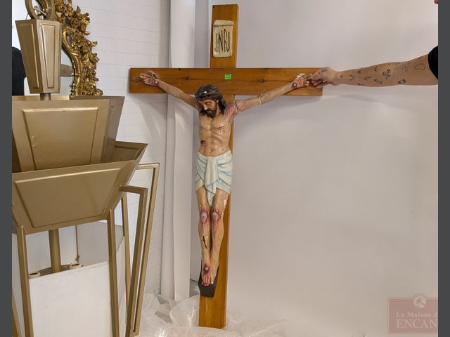 Lot # 179 - Ancien crucifix d'église avec christ en plâtre peint à la main, mesurant 74 pouces de hauteur (bras à recollé)