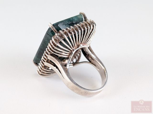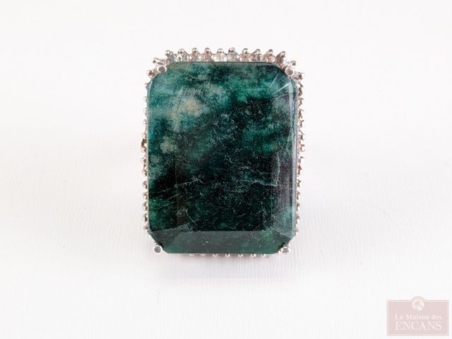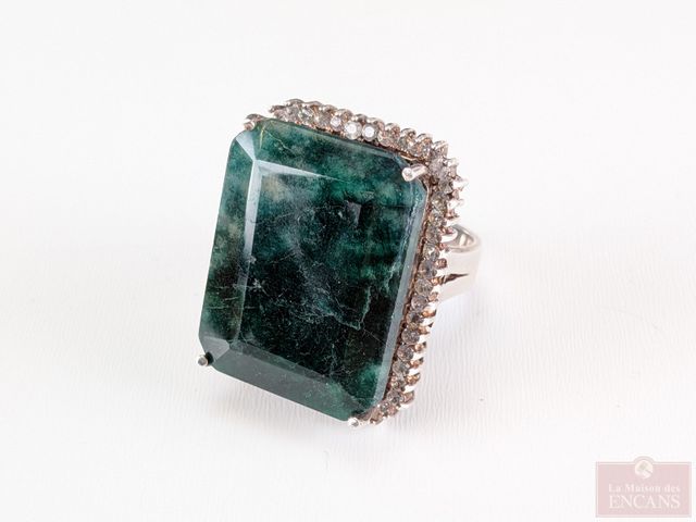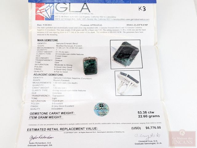 Lot # 106 - Bague en argent sterling sertie de multiples saphirs et d'une émeraude principale, taille 7, l'émeraude pesant plus de 53 carats, pour un poids total approximatif de 1.60 carats, avec certificat d'évaluation à 6 776 dollars US