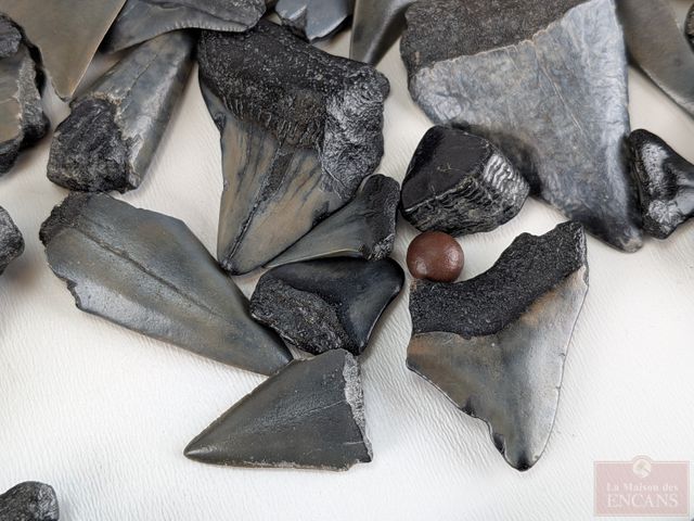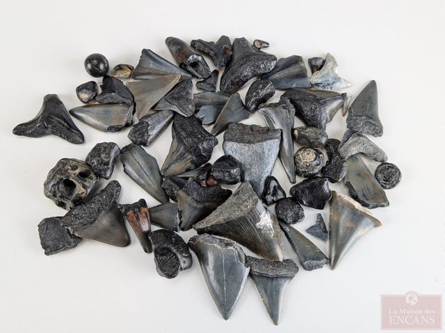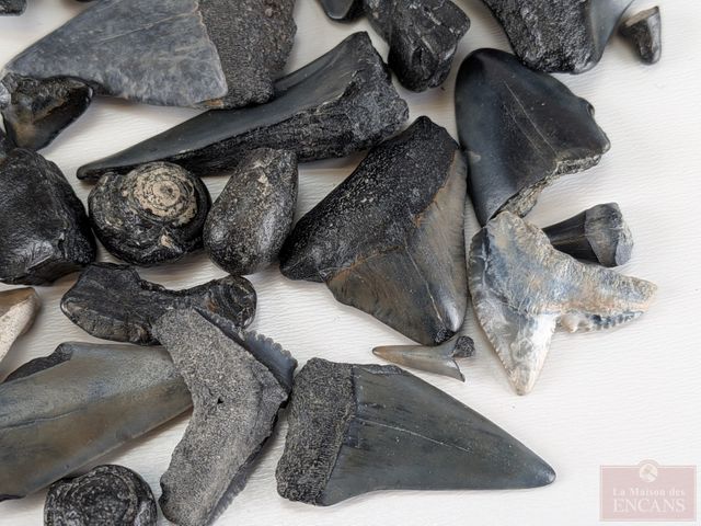Dent de requin fossilisée, ainsi que carapace fossilisée, le tout provenant du golfe du Mexique
