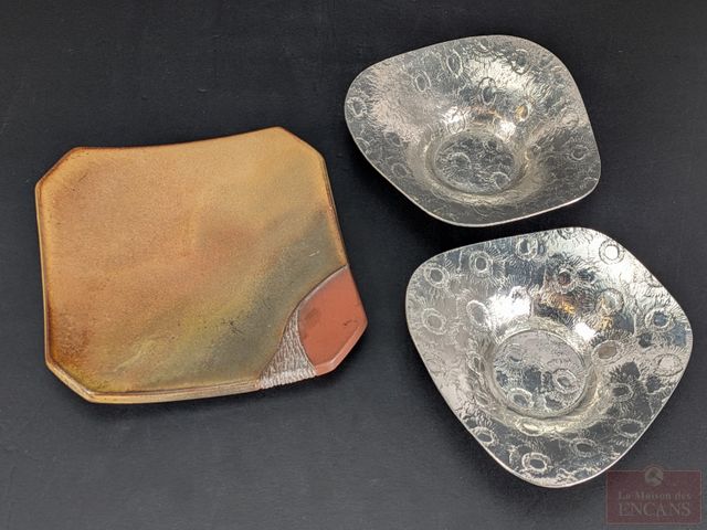 Lot # 39 - Deux étains de l'Atelier Chaudron, Val-David, ainsi qu'une céramique signée mesurant 7.5 pouces