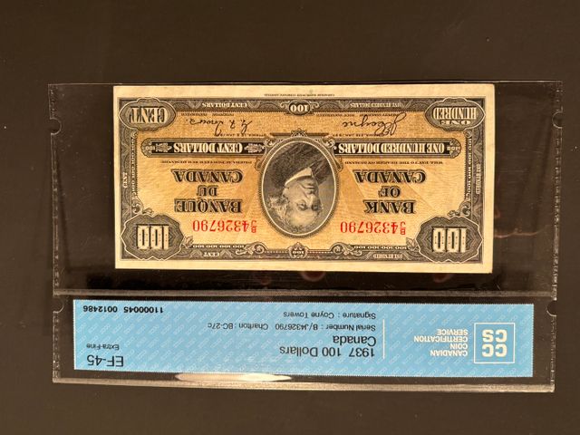 Lot # 85 - Billet de $100 1937 certifié CCCS EF-45 signature Coyne-Towers (en très bonne condition)