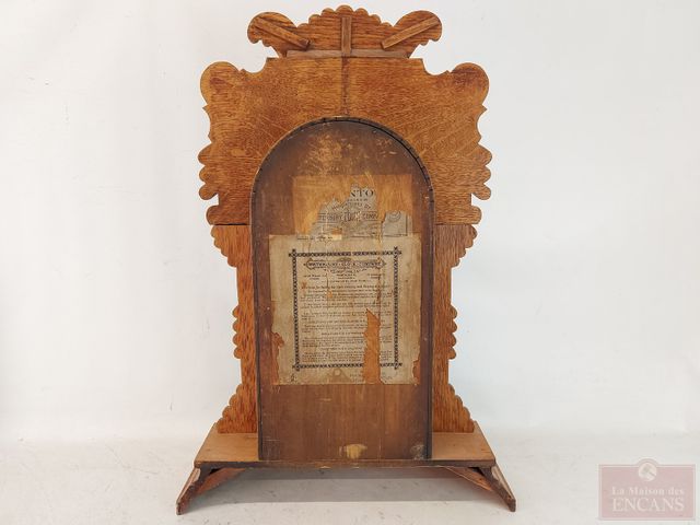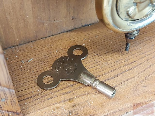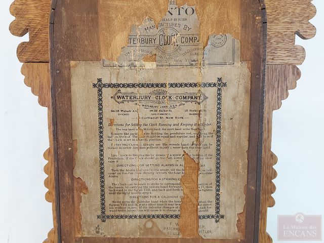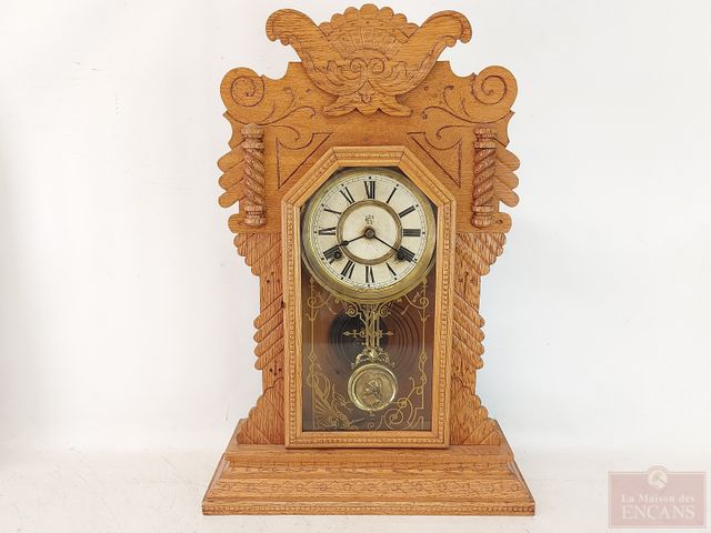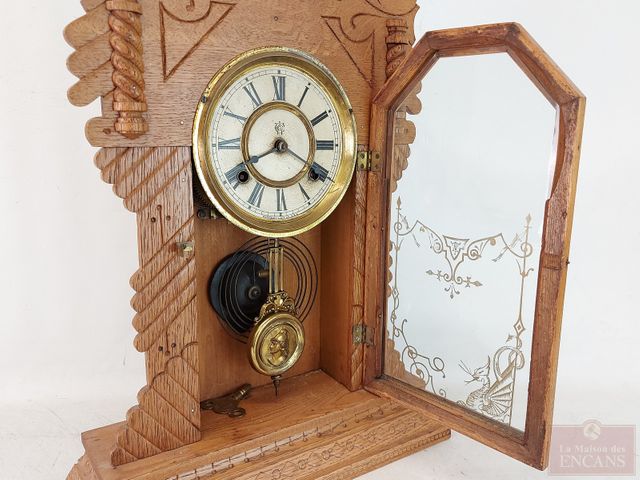 Lot # 41 - Horloge Waterbury ''gingerbread'' faite aux États-Unis datant du début du 20em siècle avec pendule et clef - mesurant 22 pouces de hauteur SOLD