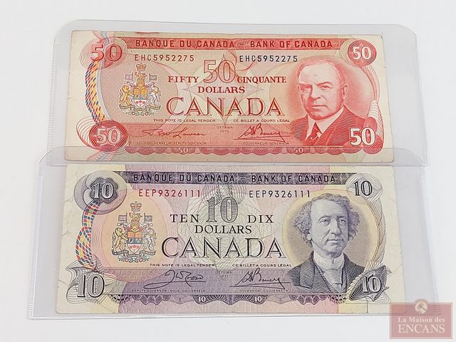 Lot de billets canadiens, dont trois billets de vingt dollars 1979, cinq billets de vingt dollars 1969, trois billets de cinq dollars 1979, un billet de cinq dollars 1972, un billet de dix dollars 1971, un billet de cinquante dollars 1975, dix billets de un dollar 1973 et trois billets de deux dollars 1974
