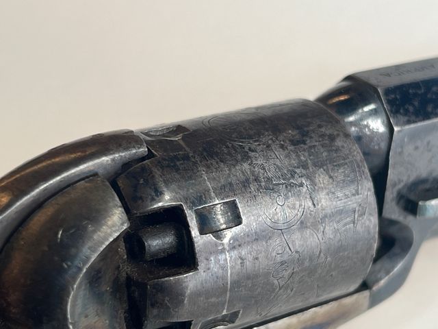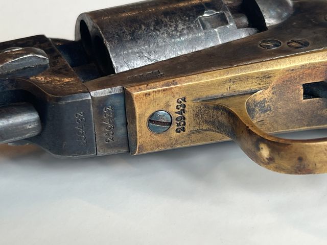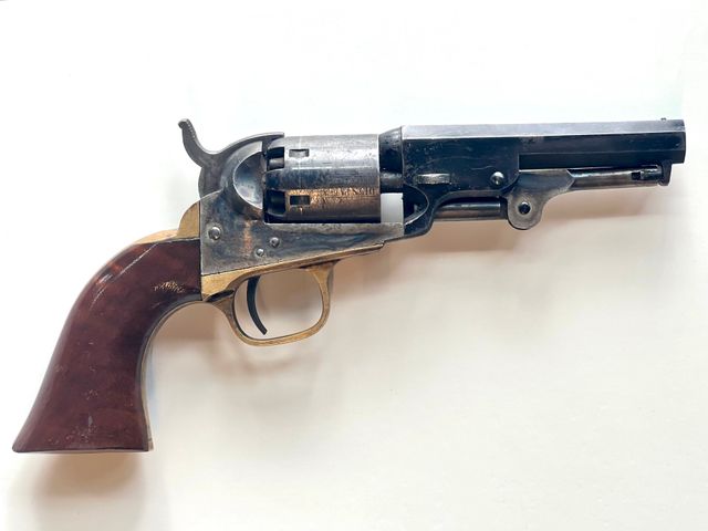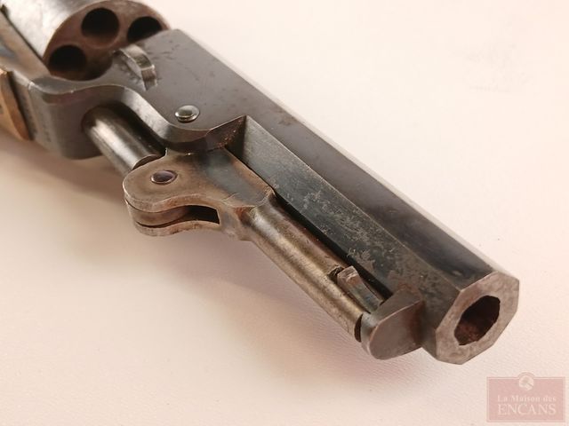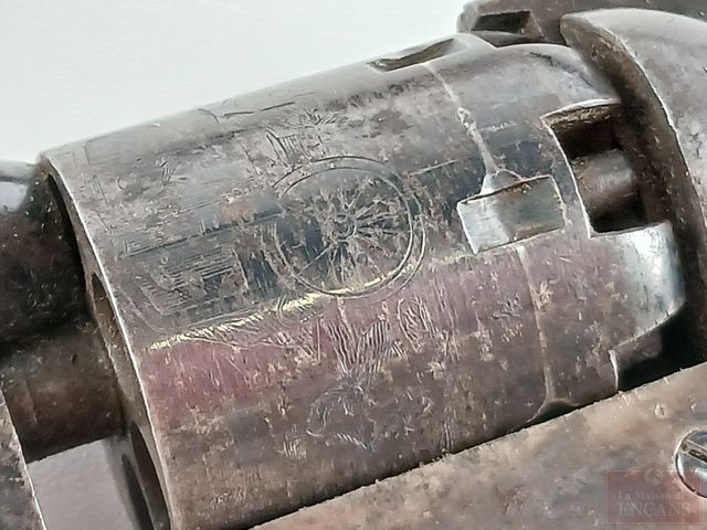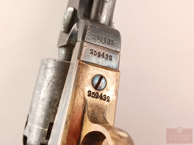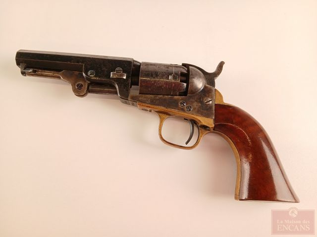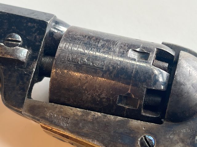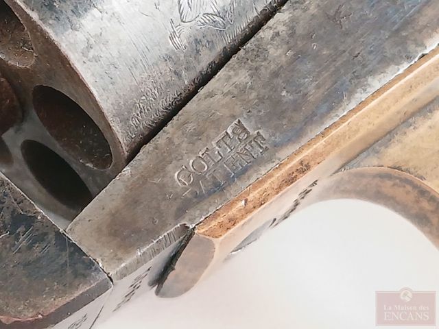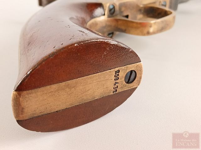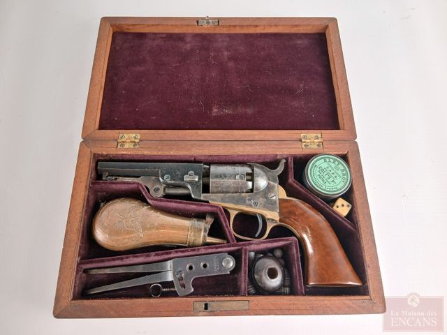 Lot # 120 - Rare revolver Colt ''Pocket'' modèle 1839, fabriqué en 1861, avec son poudrier, dés en os, amorces, balles et sa clef, dans son coffret mesurant 10 pouces. Pièce de musée, canon 4 pouces, antiquité, aucun permis requis SOLD