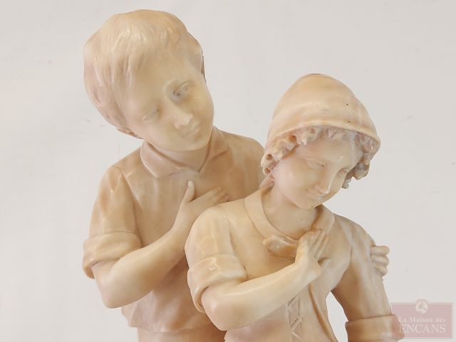 Lot # 165 - Sculpture sur albâtre mesurant 23 pouces de hauteur représentant un couple - réparation à la base - datant du début du 20em siècle SOLD