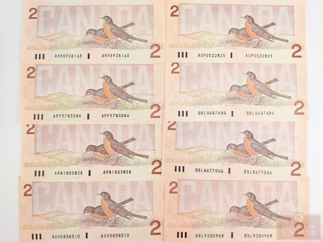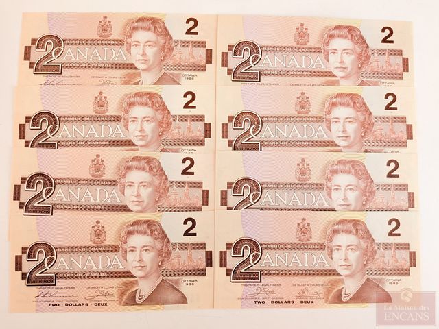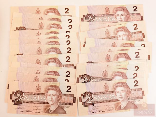 Lot de trente billets canadiens de deux dollars 1986, incirculés