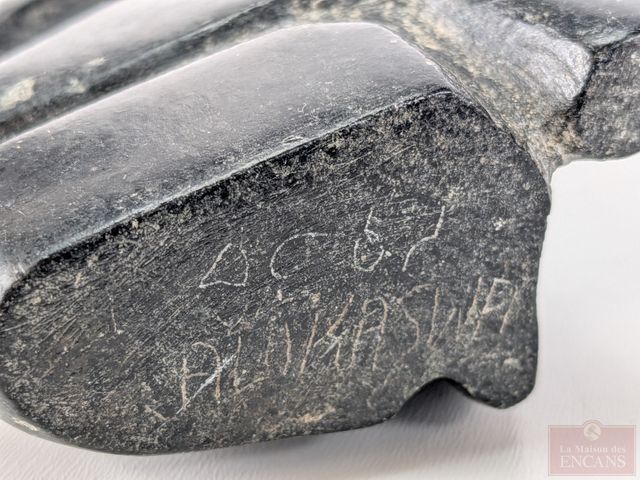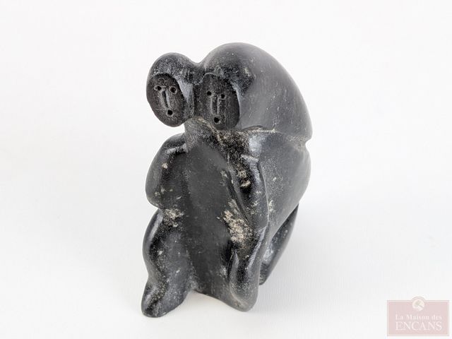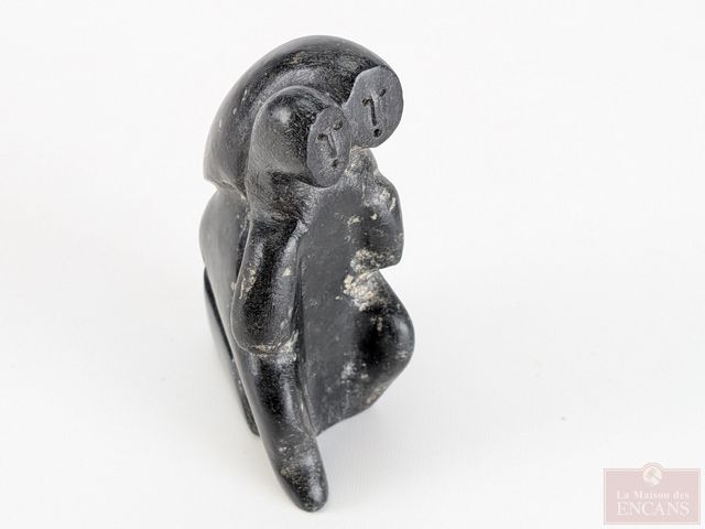 Lot # 28 - Marc ALIKASWA (1928-2008) - Rare sculpture abstraite inuite (époque esquimaude) représentant une mère et son enfant, signée par le célèbre artiste, dont de nombreuses œuvres sont exposées dans différents musées de la civilisation à Hull, Québec, etc., mesurant 3.75 pouces de hauteur, en excellente condition avec une superbe et ancienne patine