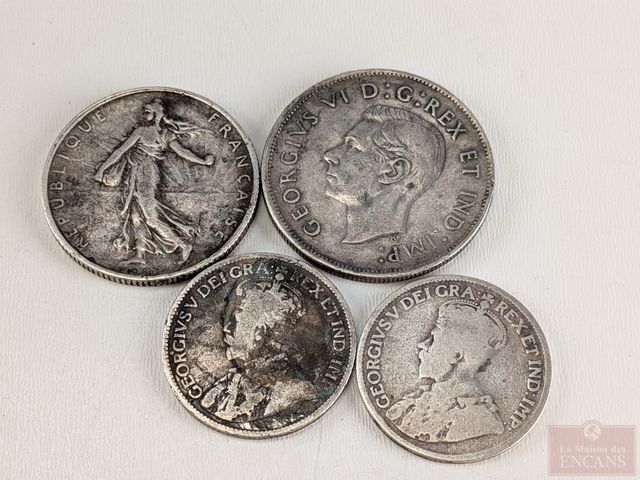 Lot # 101 - Lot de pièces de monnaie en argent, dont pièce de deux francs 1918, deux pièces canadiennes de vingt-cinq sous 1918 et pièce canadienne de cinquante sous 1944