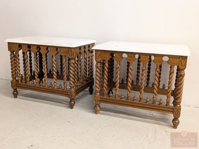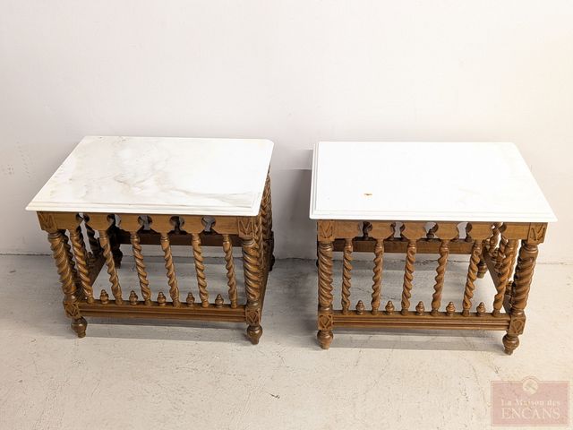 Jolie paire de table d'appoint de style jacobin en bois de noyer avec dessus de marbre à double biseaux, circa 1940, mesurant 21.5x15x17.5 pouces chacune et en excellente condition