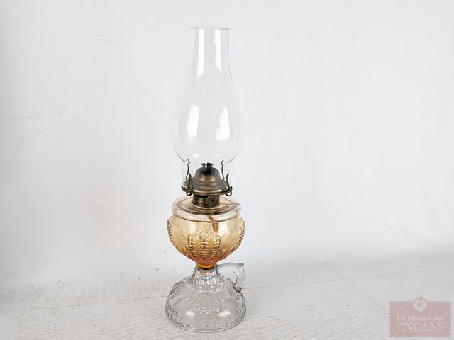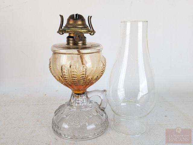 Lot # 27 - Rare modèle de lampe à l'huile portative avec anse en verre à motifs de plumes, signée Eagle U.S.A, entière originale, datant de la fin du 19eme siècle, mesurant 14.5 pouces et en excellente condition