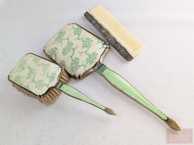 Ancien ensemble de beauté en laiton guilloché, circa 1900, comprenant peigne, brosse et miroir mesurant 14 pouces