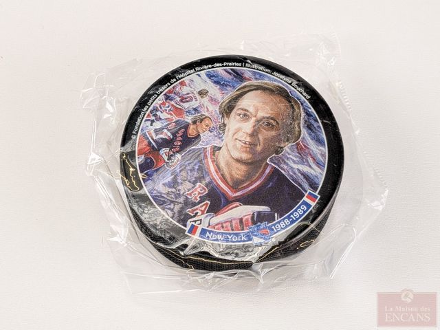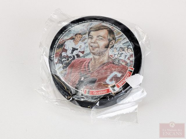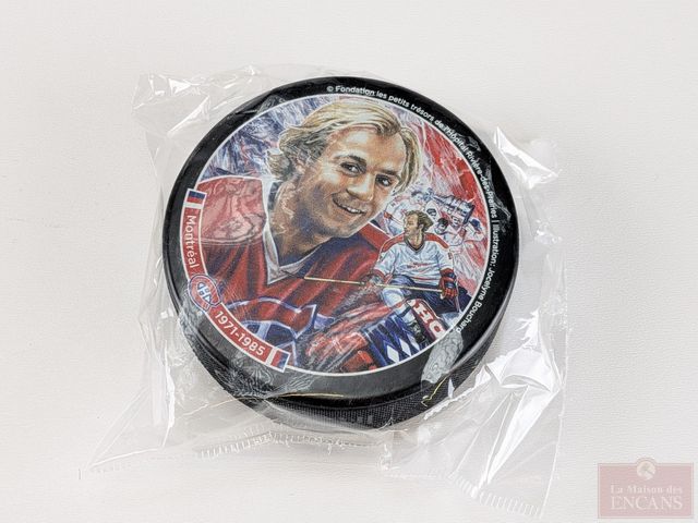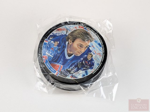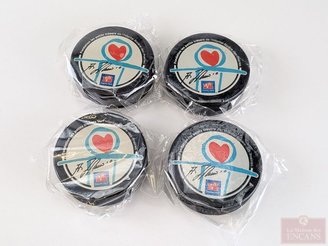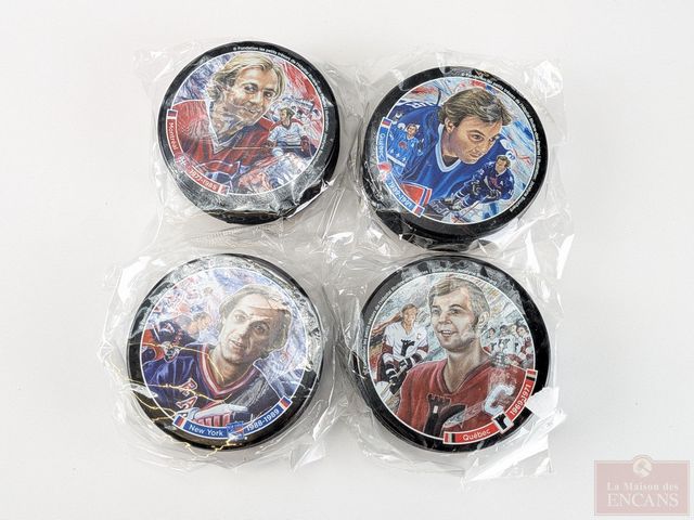 Quatre rondelles de hockey collection Guy Lafleur avec les équipes pour lesquelles il a joué, comprenant les Remparts de Québec (1969-1971), les Canadiens de Montréal (1971-1985), les Rangers de New-York (1988-1989) et les Nordiques de Québec (1989-1991), jamais ouvertes