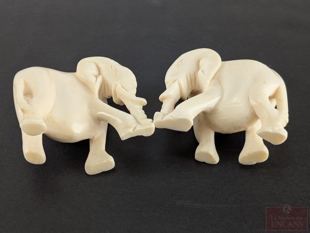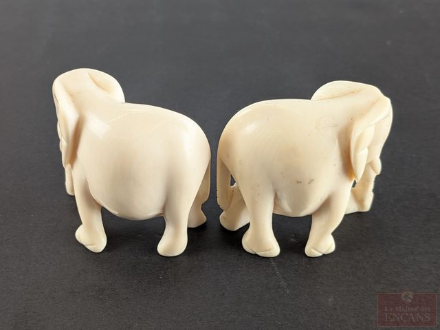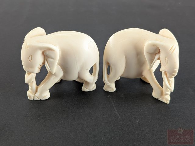 Deux éléphants sculptés sur ivoire, circa 1940, mesurant 2 pouces de largeur