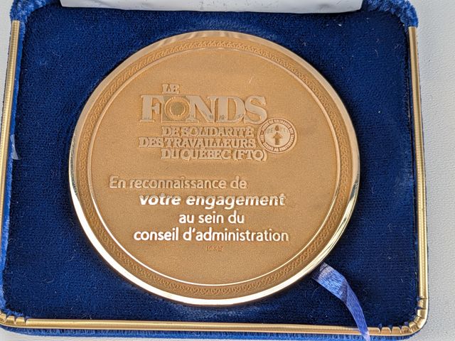 Médaille en or 10k Le fond de solidarité 1997, célébrant deux milliards de dollars d'actifs et mesurant 2.75 pouces de largeur