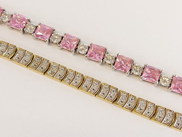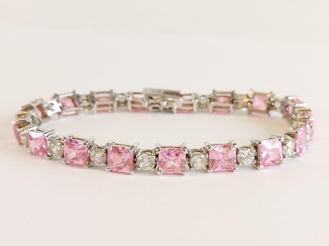 Lot # 22 - Deux bracelets en argent sertis de pierres ainsi qu'une chaine et pendentif en argent et nacre de perles la chaine mesurant 17 pouces SOLD