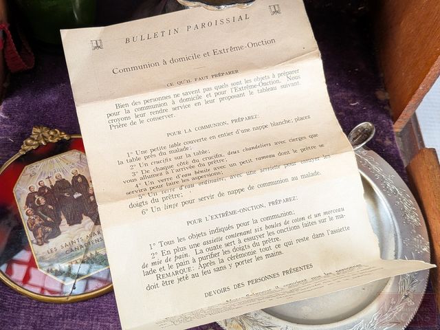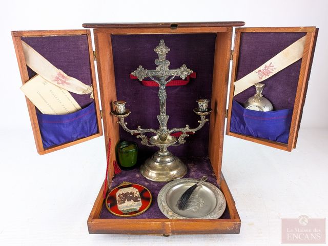 Lot # 50 - Ancien viatique avec sa croix, son assiette à hosties, bénitier et autres, mesurant 15 pouces de hauteur