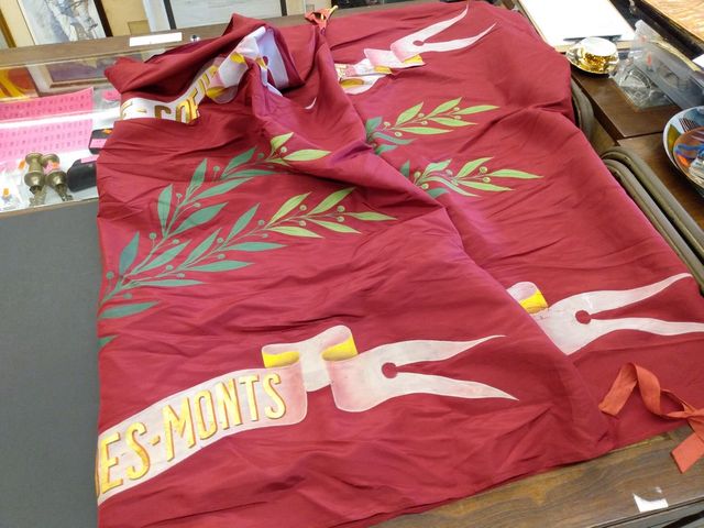 Lot # 85 - Drapeau de procession religieuse La ligue du sacré cœur à Saint Agathe des Monts mesurant 44x65 - petites déchirures - peint à la main sur soie SOLD