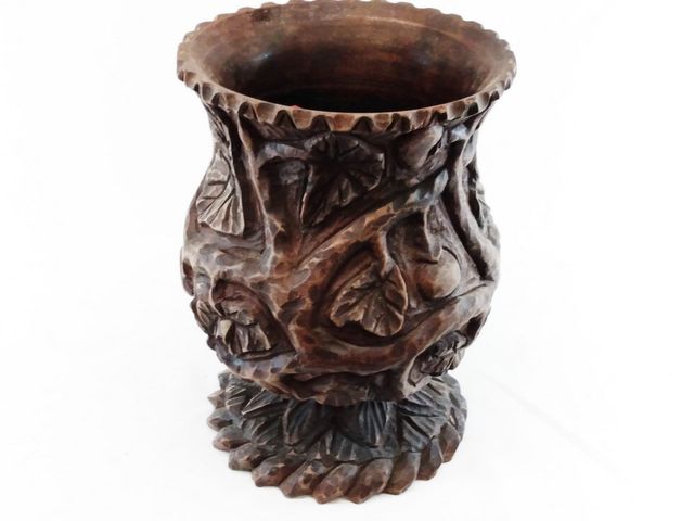 Lot # 90 - Vase sculpté sur bois 11 pouces de hauteur signé SOLD
