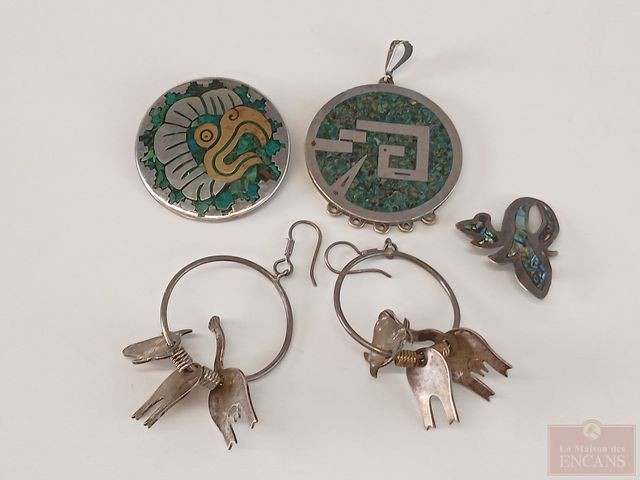 Lot # 216 - Lot de bijoux en argent comprenant broches, pendentif et paire de boucles d'oreilles sertis de nacre de perle et de turquoises, le pendentif mesurant 2.5 pouces VENDU