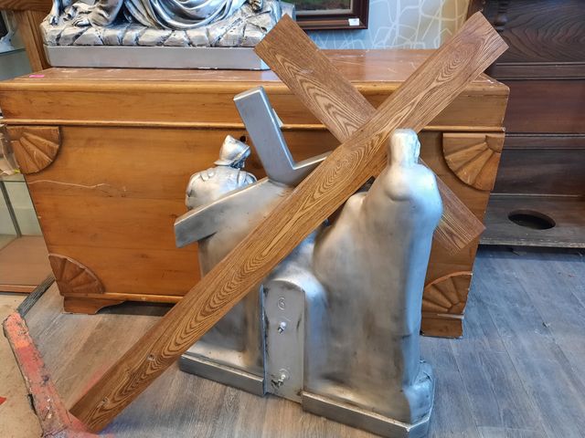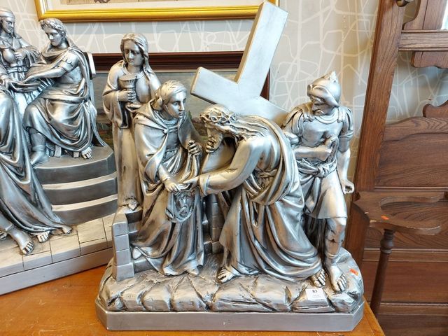 Lot # 83 - Trois plâtres représentant des stations de chemin de croix - réalisés dans l'atelier Petrucci - pré 1949 - mesurant 27 pouces de hauteur par 24 pouces de largeur - avec leur croix en bois VENDU