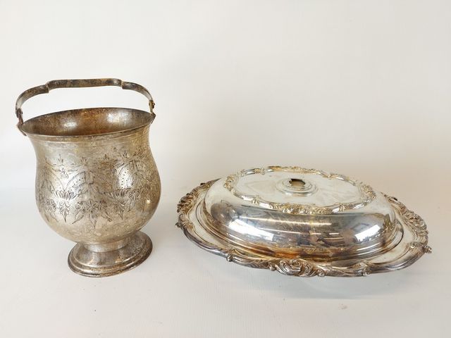 Lot # 180 - Gros lot varié dont un lot d'argenteries vintages comprenant plats de service - coupes - balais brosse - cabaret mesurant 17.5 pouces - ainsi qu'un lot d'éléments décoratifs du Moyen-Orient dont une théière mesurant 16 pouces de hauteur SOLD