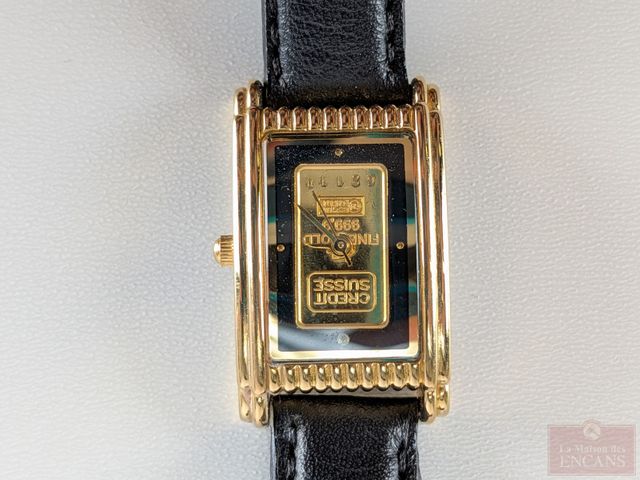 Montre avec lingot d'un gramme d'or pur 9999 Crédit Suisse, mouvement au quartz, mesurant 22 millimètres avec sa couronne