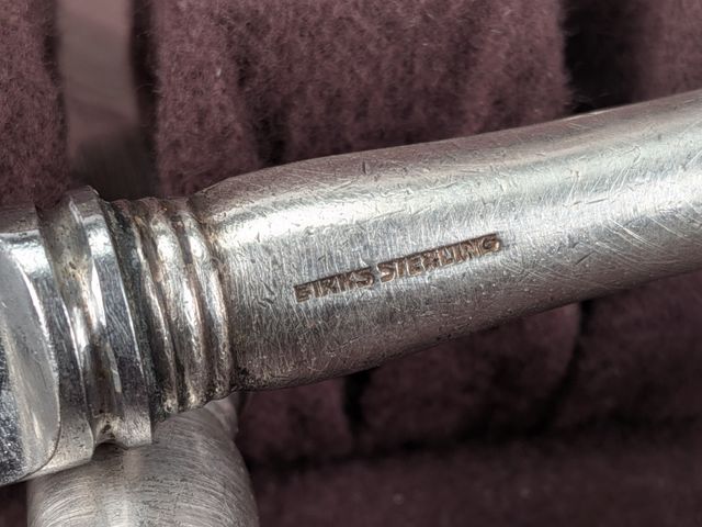 Lot # 220 - Coutellerie vintage Birks Old English patern avec lame Francaise Birks Montréal circa 1950 pour six personnes avec manches en argent sterling, dans un joli coffret. Ustensiles disponibles en ligne à partir de $100.00 l'unité.
