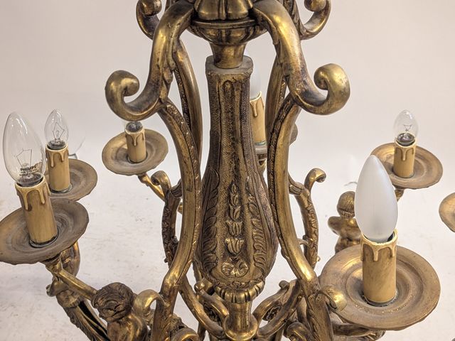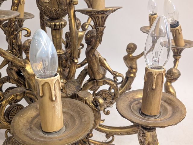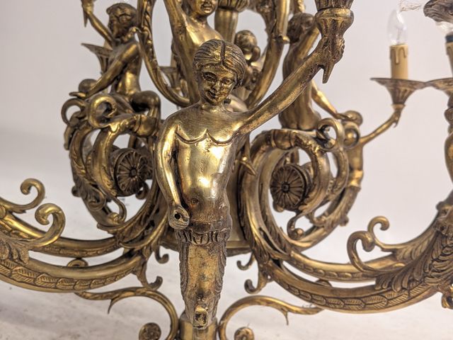 Superbe lustre en bronze doré à motifs floraux et de sirènes mesurant 35 pouces de hauteur - très lourd