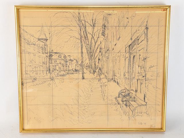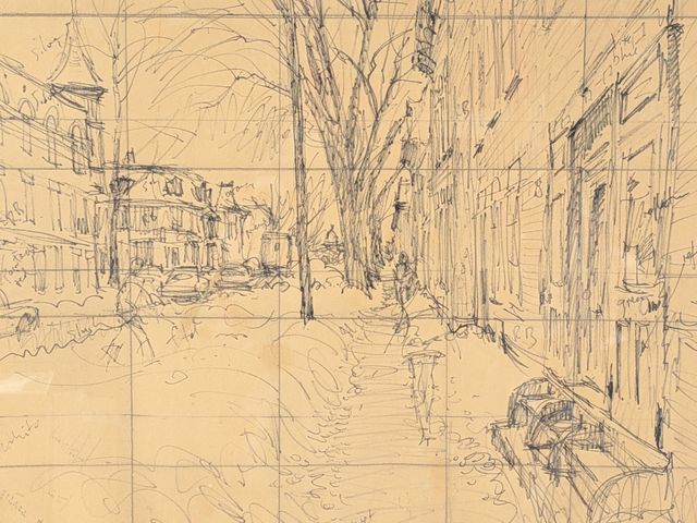 Lot # 27 - John LITTLE (1928-2024) – Esquisse mis au carreau, signée, datée février 1974, mesurant 14x16.5 pouces avec sceau d'atelier - avec legendes de couleur, materiaux et conditions de neige au sol – Rue Plessis près de Logan