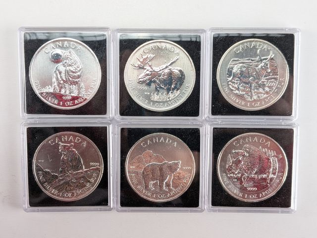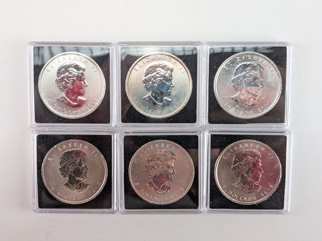Lot # 197 - 6 Pièces de 5 dollars canadiens – Once d’argent pur 9999 – encapsulées sans taxes – 2x2011 – 2x2012 – 2x2013