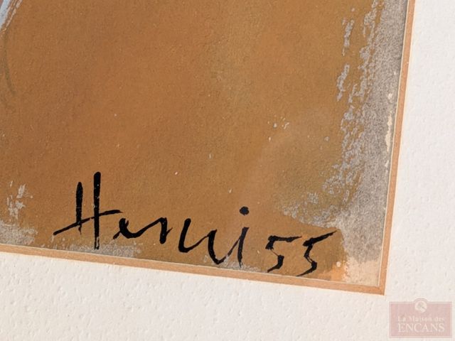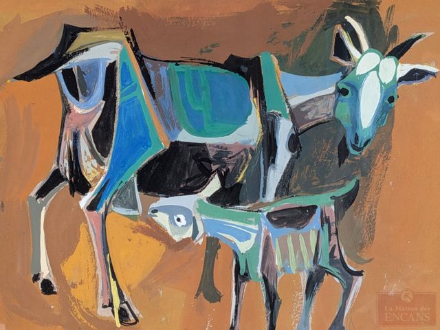 Lot # 7 - HENRI – Gouache sur papier signée mesurant 7 par 9.5 pouces daté 55 – chevreau avec sa mère