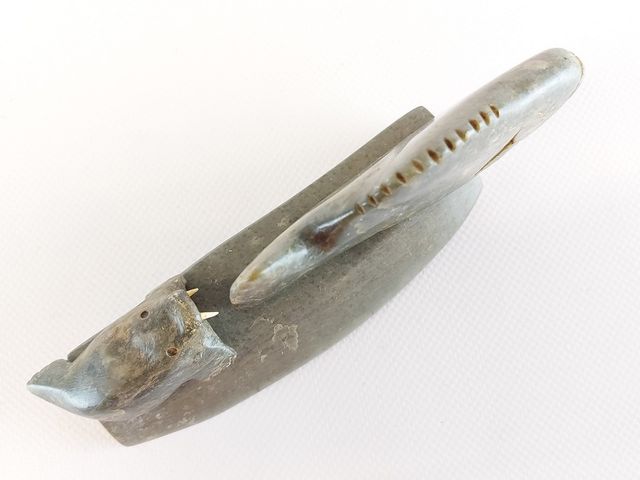 Rare sujet sculpté dans une très jolie pierre verte veinée blanche d'après une légende esquimaude à caractère humoristique représentant un morse avec ses défenses en ivoire poursuivant un énorme poisson - signé en esquimau - 6.75 pouces de longueur - avec une extraordinaire patine très ancienne - en excellente condition - fabuleuse collection forcati - archéologue et historien